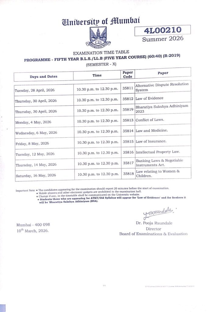 HomeNoticesEXAMINATION TIME TABLE March 30, 2026 PROGRAMME FIFTH YEAR B.L.S./LL.B (FIVE YEAR COURSE) (60:40) (R-2019) (SEMESTER – X)